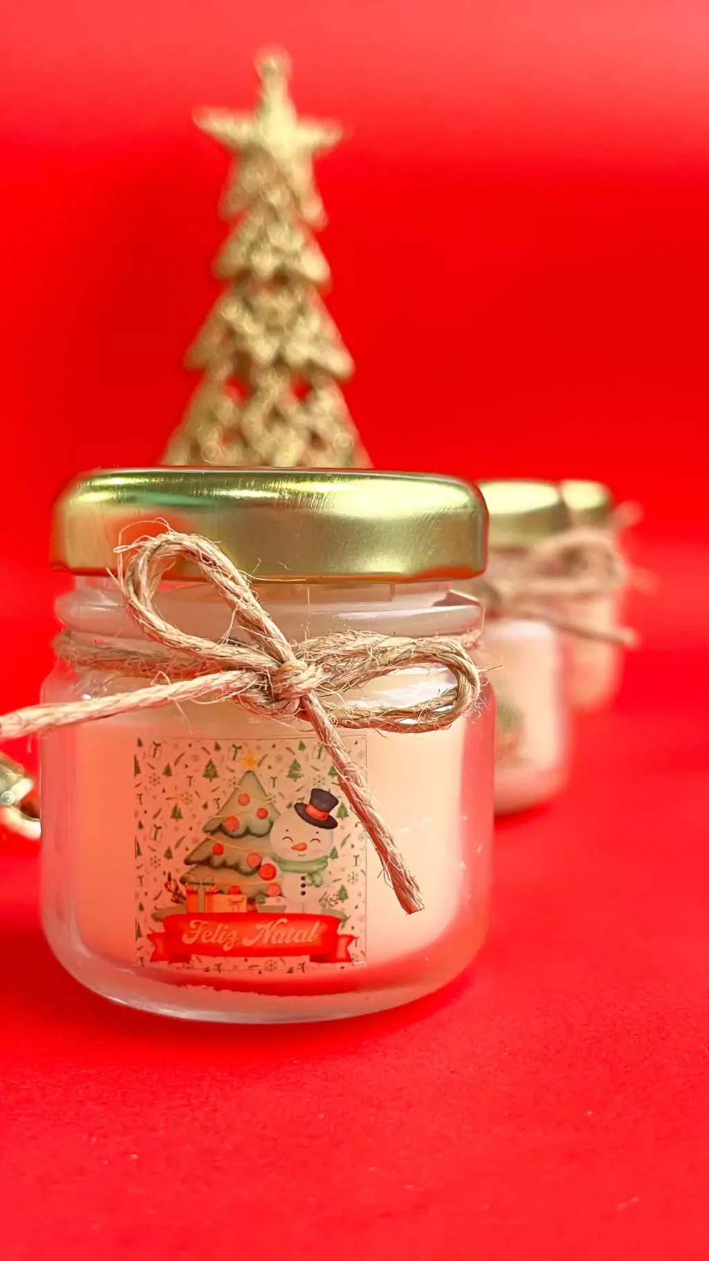 Cada peça é uma vela aromática em vidro de 30g personalizada com sua logo e arte natalina, ideal para ações corporativas, lembranças de fim de ano, eventos e kits de presente.